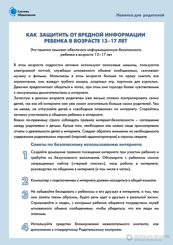 Зачастую в данном возрасте родителям уже весьма сложно контролировать своих детей, так как об Интернете они уже знают значительно больше своих родителей. Тем не менее, не отпускайте детей в "свободное плавание" по Интернету. Старайтесь активно участвовать в общении ребенка в Интернете.